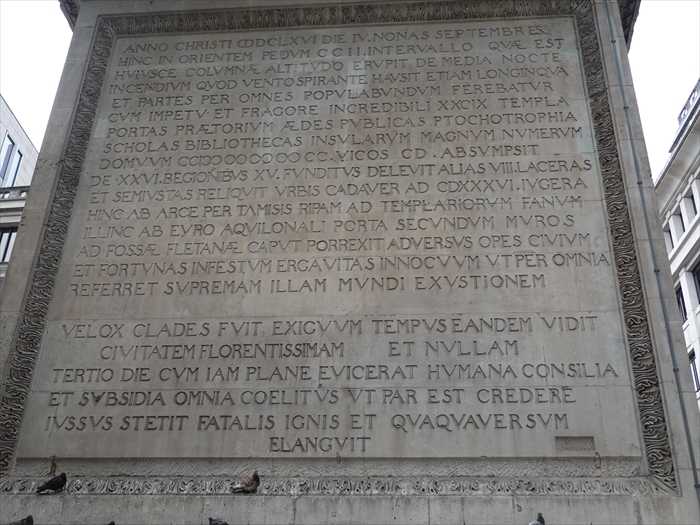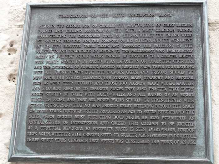 Charles the Second, son of Charles the Martyr, King of Great Britain, France and Ireland, Defender of the Faith, a most Gracious Prince, commiserating the deplorable state of things, whilst the ruins were yet smoking, provided for the comfort of his citizens and the ornament of his city; remitted their taxes, and referred the consideration of the reparation of the Magistrates and Inhabitants of London to the Parliament, who immediately passed an Act that public works should be restored to a greater beauty, with public money to be raised by an imposition on coals, that churches, and the Cathedral of St Paul’s should be rebuilt from their foundations, with great magnificence; that the bridges, gates and prisons should be new made; the sewers cleansed; the streets made straight and regular; such as were steep levelled and those too narrow made wider, markets and shambles removed to separate places. They also enacted that every house should be built with party-walls, and all raised of an equal height in front; and that all house-walls should be strengthened with stone or brick; and that no man should delay building beyond the space of seven years. Furthermore, he procured an Act to settle beforehand the differences about meum and tuum (mine and yours), boundaries also being settled. An annual service of intercession was also established, and he caused this column to be erected as a perpetual memorial to posterity. Jesus it seems everywhere, London rises again, whether with greater speed or greater magnificence is doubtful. Three short years complete that which was considered the work of an age.」