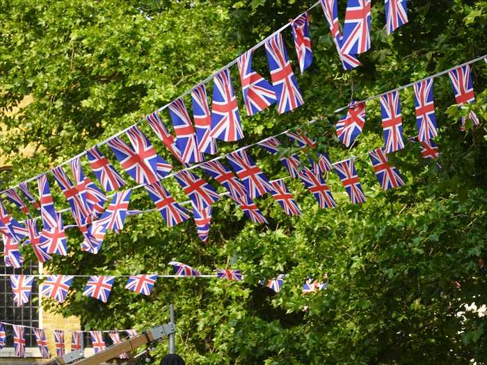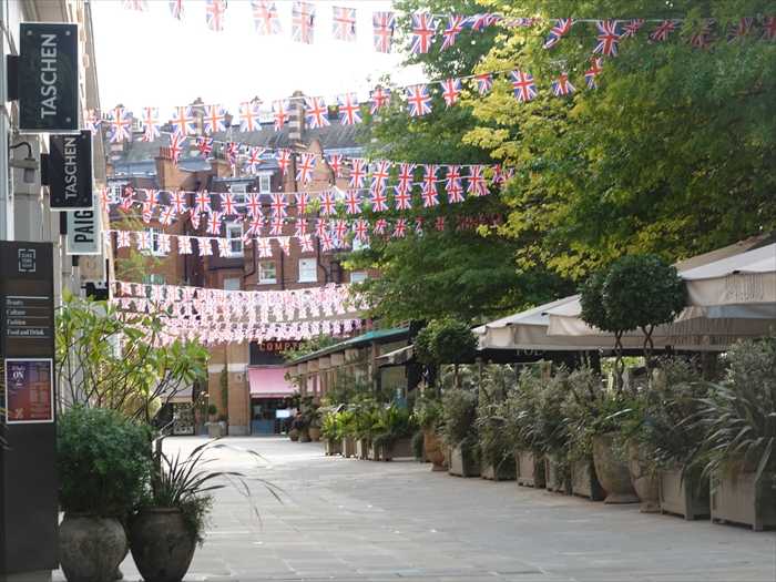 Duke of York Square(デューク・オブ・ヨーク・スクエア)内の ショッピング&レストラン街 の一角。 無数のユニオンジャック(英国旗)のフラッグガーランドが飾られ、祝祭的な雰囲気。