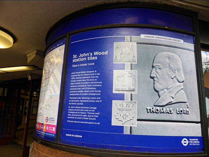 St John’s Wood and Swiss Cottage Underground stations were also decorated with a tile of cricketer Thomas Lord – namesake of Lord’s Cricket Ground, the home of English cricket, close to the station.