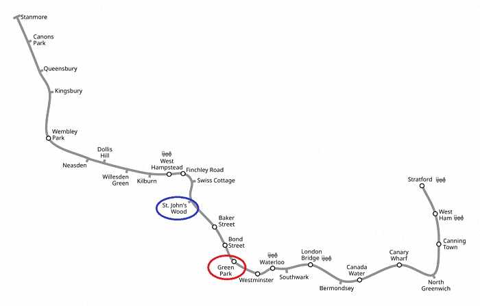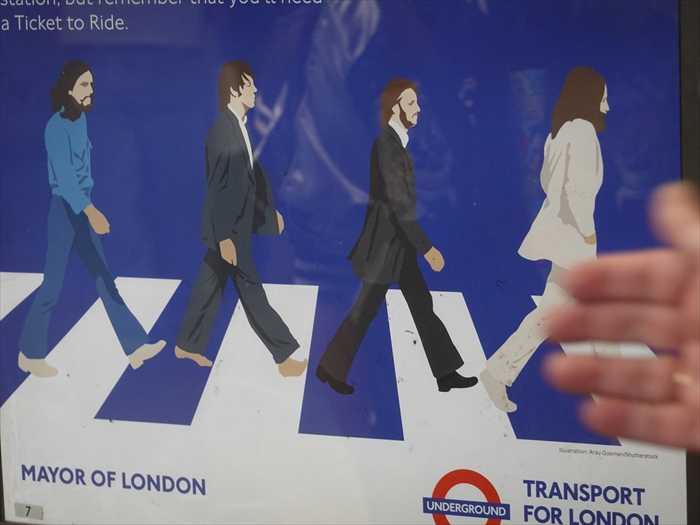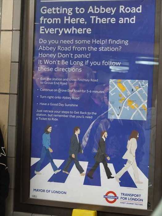 St. John’s Wood駅 構内にあるビートルズゆかりの名所Abbey Road Studios (アビイ・ロード・スタジオ) への案内ポスター。 ビートルズファン向けに「Abbey Roadへの行き方」がユーモラスに書かれていた。 「Getting to Abbey Road from Here, There and Everywhere