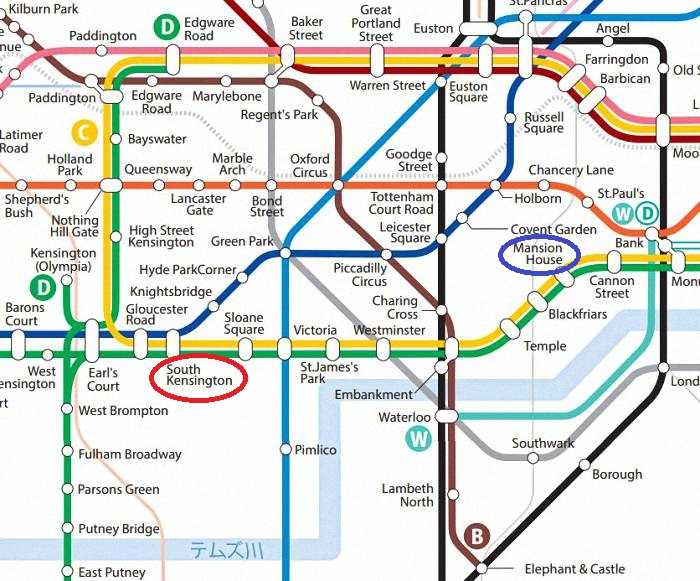 マンション ハウス・Mansion House駅からSouth Kensingtone駅まで行き下車。