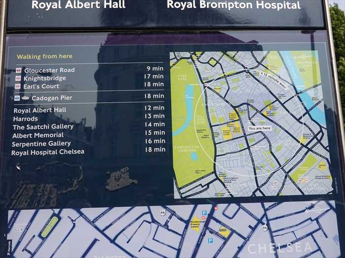 上部に Royal Albert Hall Royal Brompton Hospital の表記があり、観光客向けに徒歩での