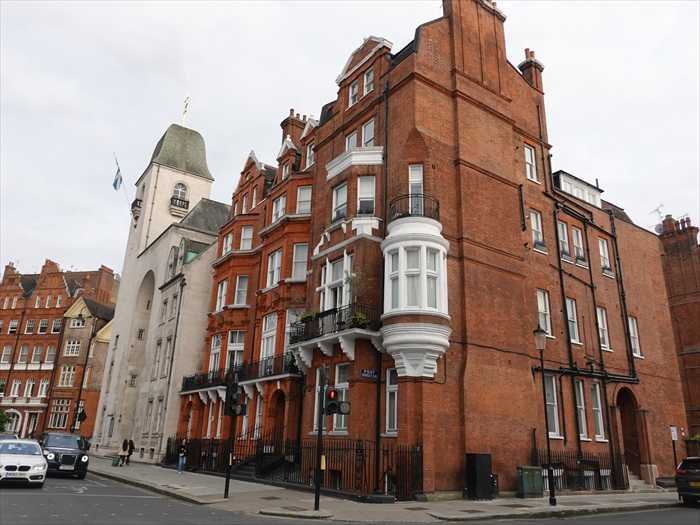 ・周辺の赤レンガの住宅街(ナイツブリッジらしい高級感ある街並み)とコントラストを