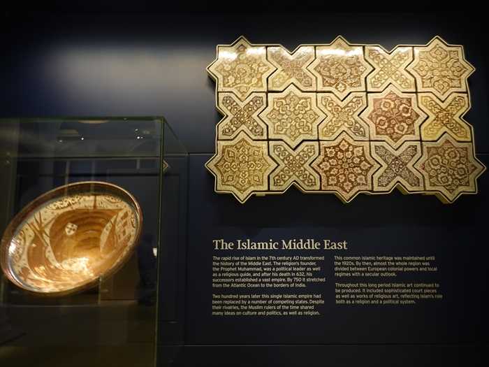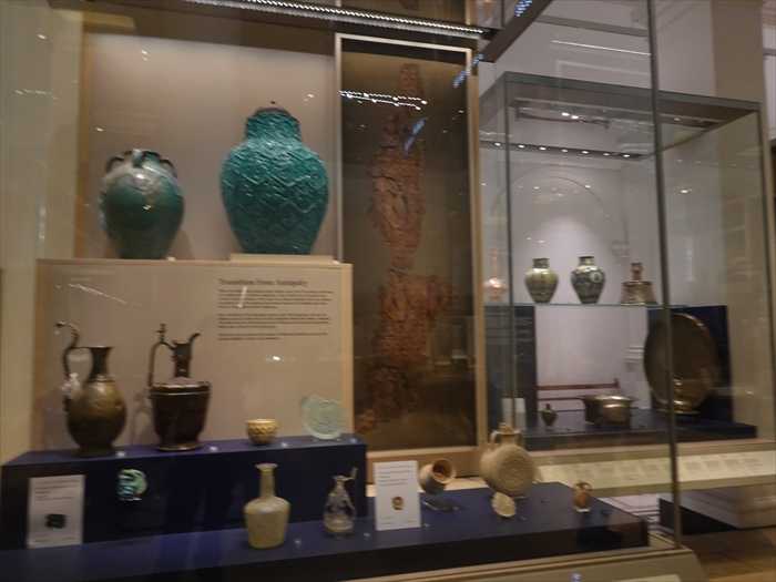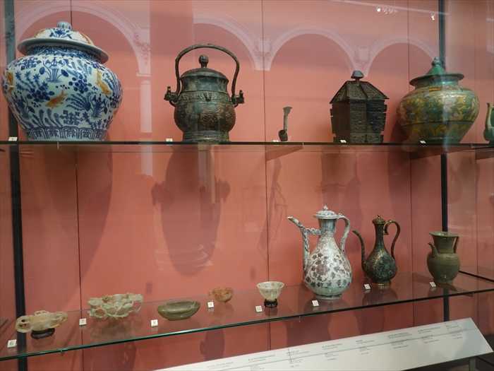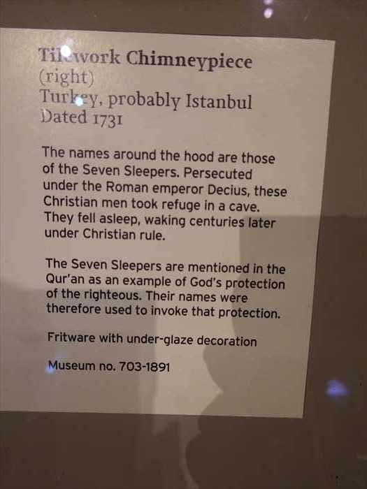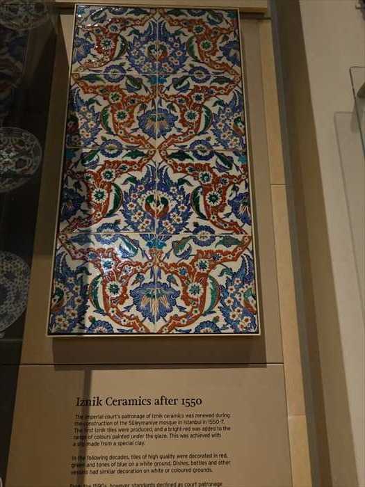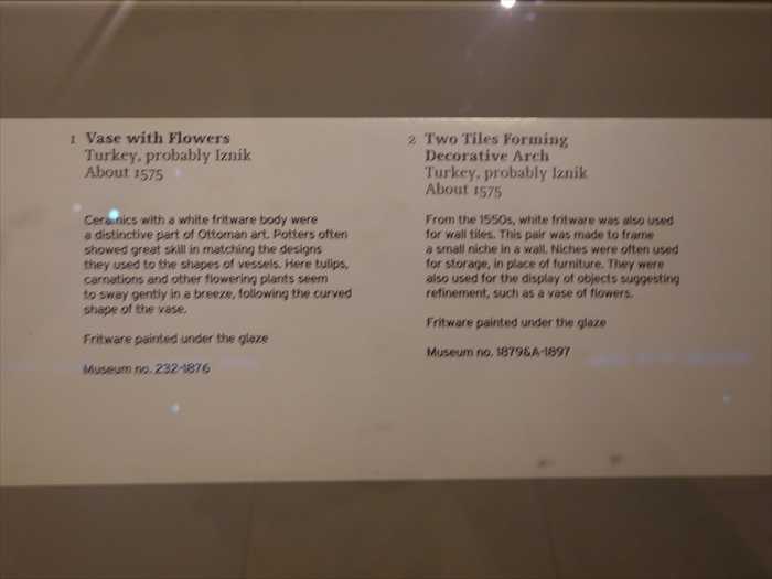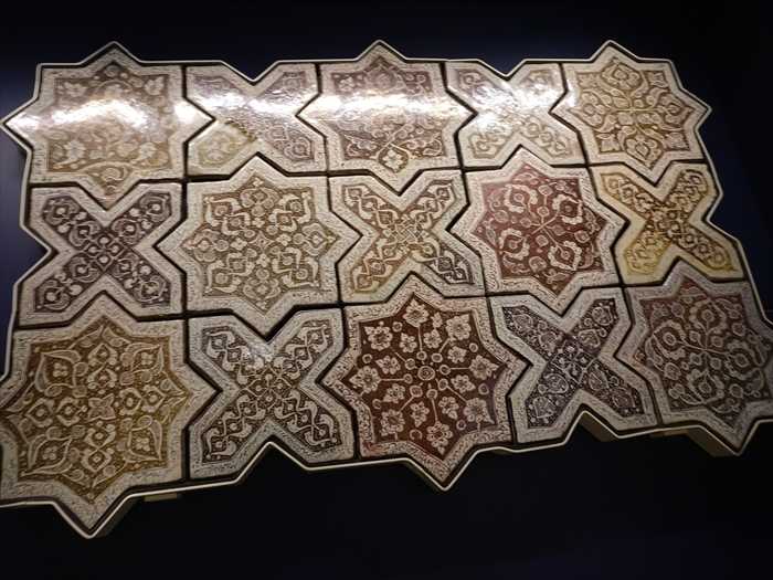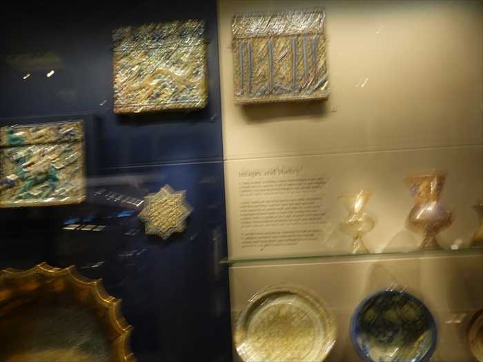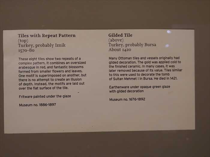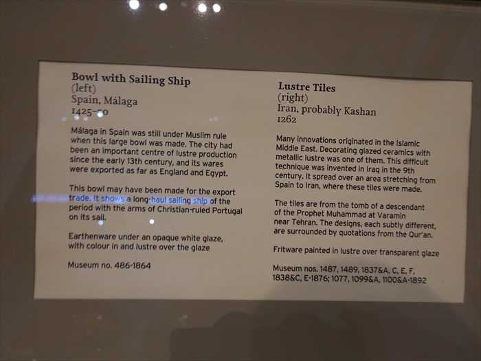 「Lustre Tiles(right)Iran, probably Kashan1262Many innovations originated in the Islamic Middle East. Decorating glazed ceramicswith metallic lustre was one of them. This difficult technique was invented in Iraq in the 9th century. It spread over an area stretching from Spain to Iran, where thesetiles were made.The tiles are from the tomb of a descendant of the Prophet Muhammad at Varaminnear Teheran. The designs, each subtly different, are surrounded by quotations fromthe Qur’an. Fritware painted in lustre over transparent glaze Museum nos. 1487, 1489, 18376A, C, E, F, 18388C, E-1876; 1077, 10996A, 11006」