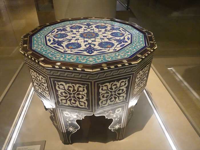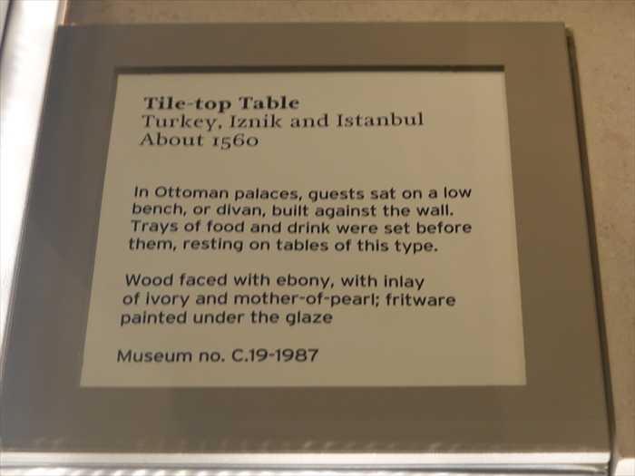 「Tile-top TableTurkey, Iznik and IstanbulAbout 1560In Ottoman palaces, guests sat on a low bench, or divan, built against the wall. Trays of food and drink were set before them, resting on tables of this type.Wood faced with ebony, with inlay of ivory and mother-of-pearl; fritware painted under the glazeMuseum no. C.19-1987」