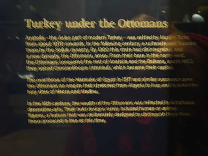 Many Ottoman tiles and vessels originally had gilded decoration. The gold was applied cold to the finished ceramic. In many cases, it was later removed because of its value. Tiles similar to this were used to decorate the tomb of Sultan Mehmet I in Bursa. He died in 1421.