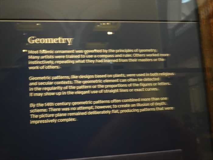 In certain times and places, however, the ban on images in religious contexts was extended to the secular sphere, and decoration was confined to calligraphic, geometric and plant-based ornament.」