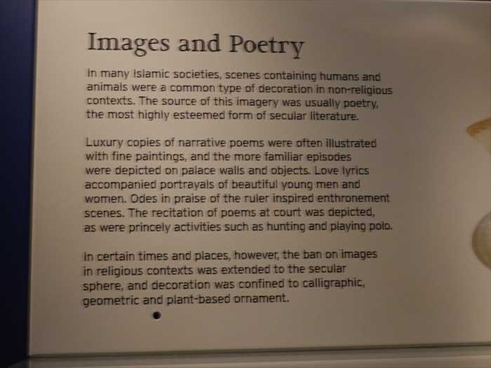 In many Islamic societies, scenes containing humans and animals were a common type of decoration in non-religious contexts. The source of this imagery was usually poetry, the most highly esteemed form of secular literature.