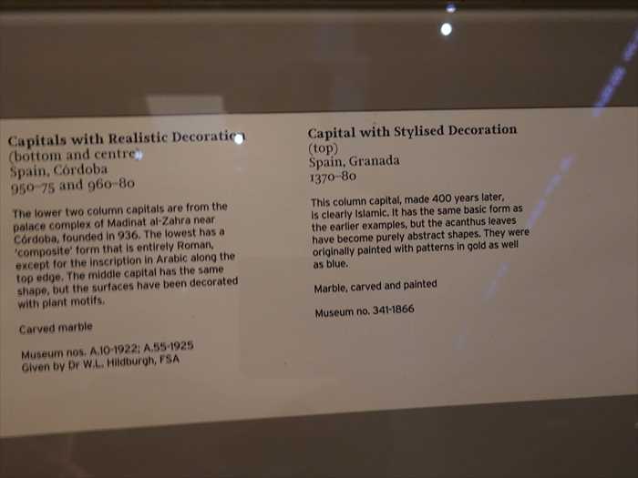 The lower two column capitals are from the palace complex of Madinat al-Zahra near Córdoba, founded in 936. The lowest has a ‘composite’ form that is entirely Roman, except for the inscription in Arabic along the top edge. The middle capital has the same shape, but the surfaces have been decorated with plant motifs.