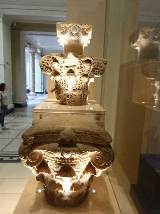 This column capital, made 400 years later, is clearly Islamic. It has the same basic form as the earlier examples, but the acanthus leaves have become purely abstract shapes. They were originally painted with patterns in gold as well as blue.