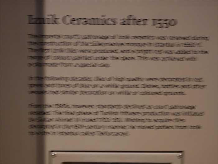 From the 1580s, however, standards declined and court patronage ceased. The tile industry in Iznik ceramic production was imitated by other towns (ifillegible?) and local demand. Waning importance led eventually in the 18th century to former imperial production being replaced in Istanbul called Tekfur Sarayi.」