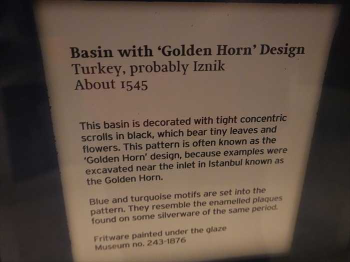This basin is decorated with tight concentric scrolls in black, which bear tiny leaves and flowers. This pattern is often known as the ‘Golden Horn’ design, because examples were excavated near the inlet in Istanbul known as the Golden Horn.