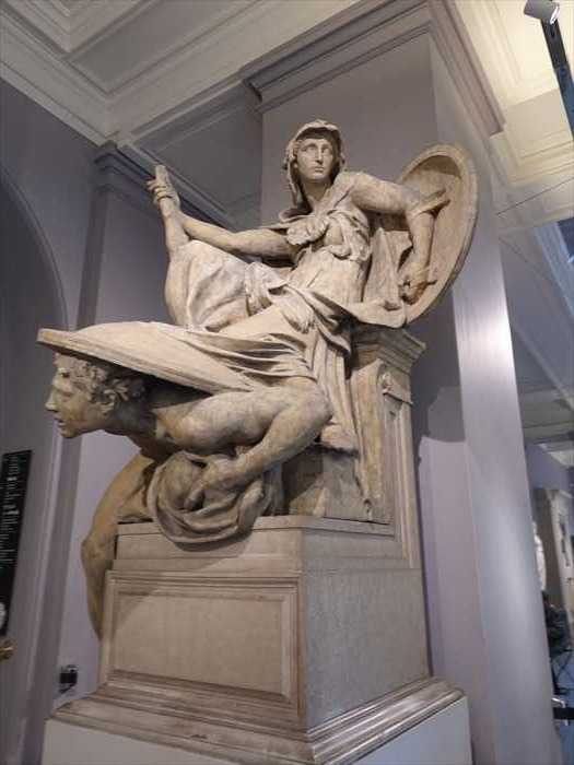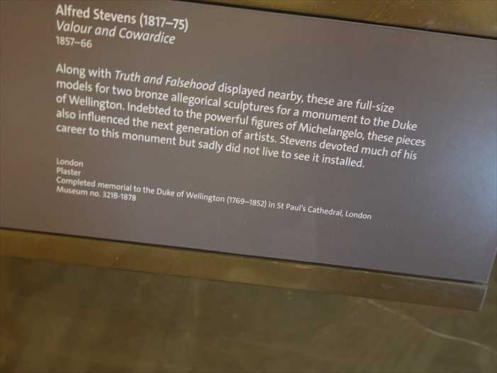 Along with Truth and Falsehood displayed nearby, these are full-size models for two bronze allegorical sculptures for a monument to the Duke of Wellington. Indebted to the powerful figures of Michelangelo, these pieces also influenced the next generation of artists. Stevens devoted much of his career to this monument but sadly did not live to see it installed.