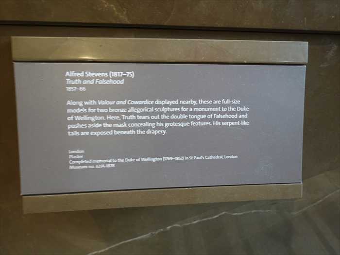 Along with Valour and Cowardice displayed nearby, these are full-size models for two bronze allegorical sculptures for a monument to the Duke of Wellington. Here, Truth tears out the double tongue of Falsehood and pushes aside the mask concealing his grotesque features. His serpent-like tails are exposed beneath the drapery.
