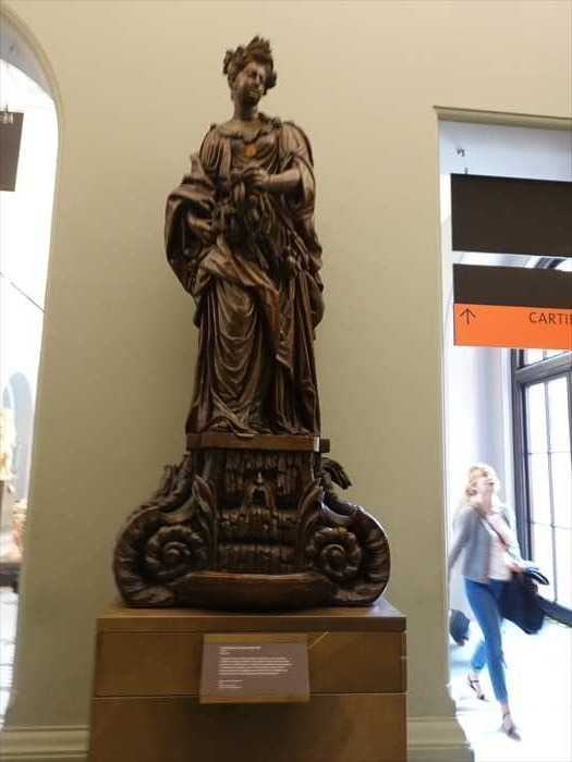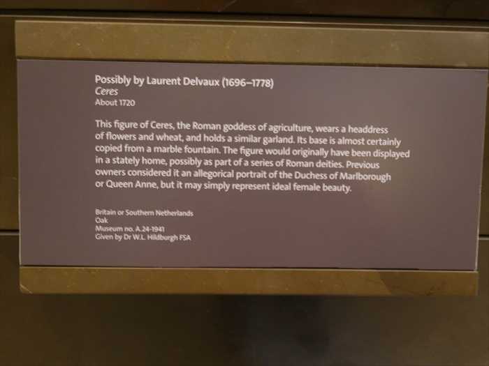 This figure of Ceres, the Roman goddess of agriculture, wears a headdress of flowers and wheat, and holds a similar garland. Its base is almost certainly copied from a marble fountain. The figure would originally have been displayed in a stately home, possibly as part of a series of Roman deities. Previous owners considered it an allegorical portrait of the Duchess of Marlborough or Queen Anne, but it may simply represent ideal female beauty.