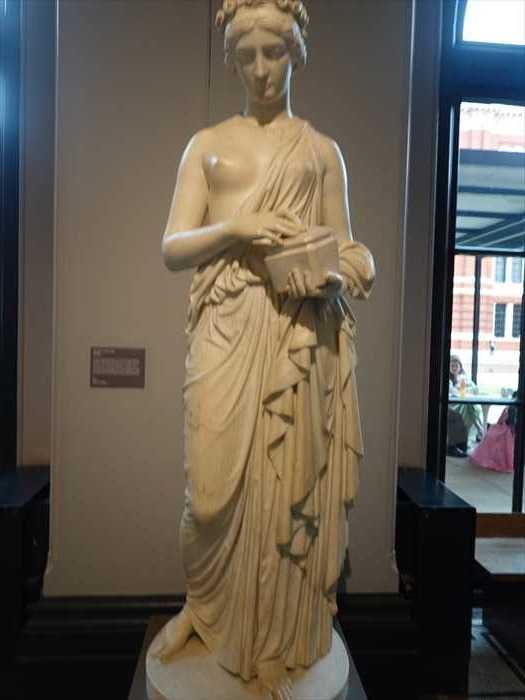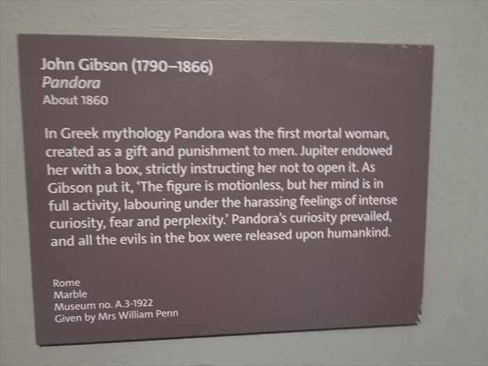 In Greek mythology Pandora was the first mortal woman, created as a gift and punishment to men. Jupiter endowed her with a box, strictly instructing her not to open it. As Gibson put it, ‘The figure is motionless, but her mind is in full activity, labouring under the harassing feelings of intense curiosity, fear and perplexity.’ Pandora’s curiosity prevailed, and all the evils in the box were released upon humankind.