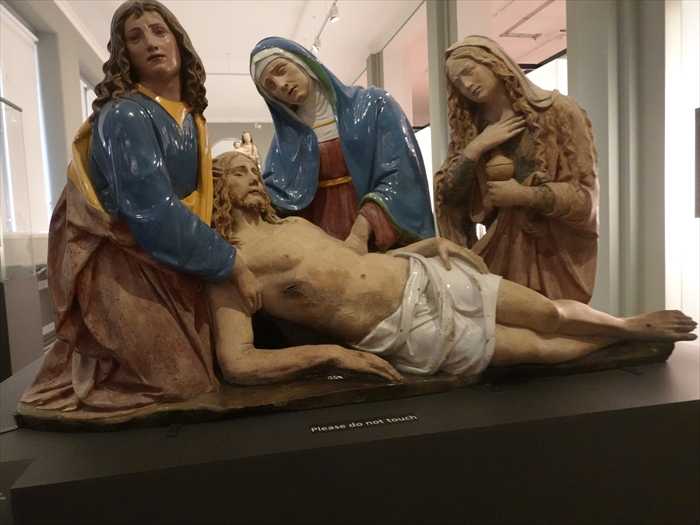 Terracotta groups on this scale were difficult to make. The figures here were each constructed separately. Mary Magdalene on the right, is now in several pieces and probably shattered after the first (or biscuit) firing. This prevented a second firing to fix the glazes, so instead the figures were painted.
