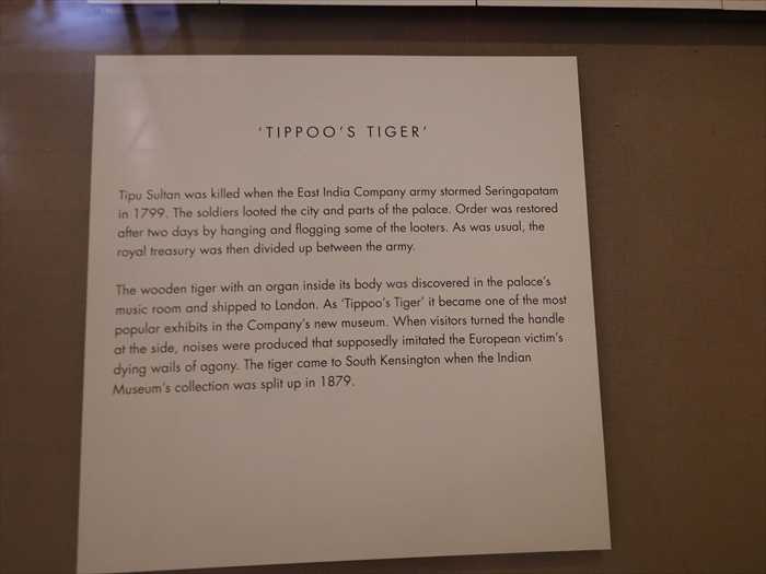 Tipu Sultan was killed when the East India Company army stormed Seringapatam in 1799. The soldiers looted the city and parts of the palace. Order was restored after two days by hanging and flogging some of the looters. As was usual, the royal treasury was then divided up between the army. The wooden tiger with an organ inside its body was discovered in the palace’s music room and shipped to London. As “Tippoo’s Tiger” it became one of the most popular