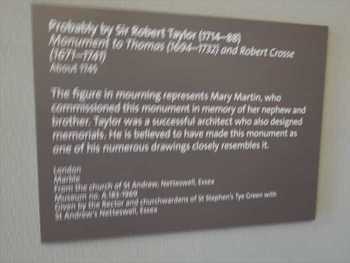 The figure in mourning represents Mary Martin, who commissioned this monument in memory of her nephew and brother. Taylor was a successful architect who also designed memorials. He is believed to have made this monument as one of his numerous drawings closely resembles it.