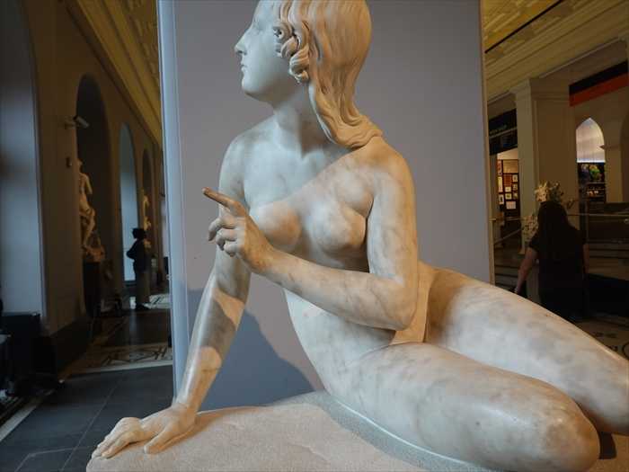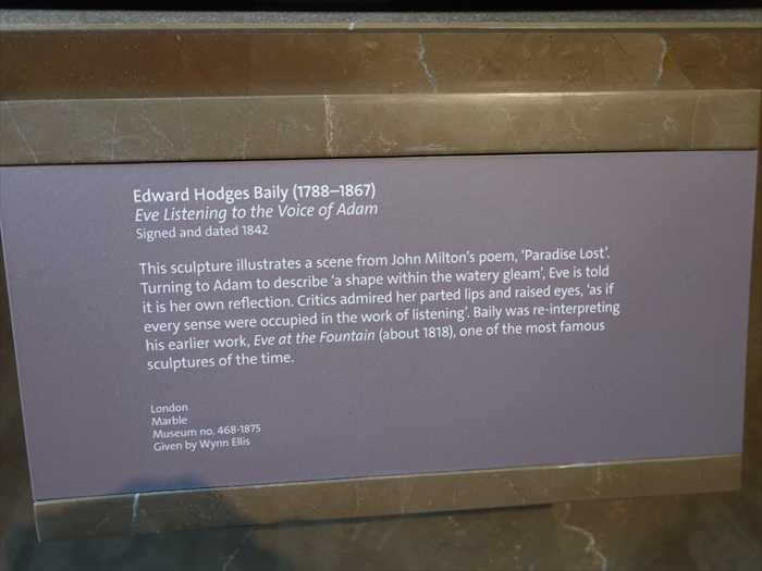 Turning to Adam to describe ‘a shape within the watery gleam’, Eve is told it is her own reflection. Critics admired her parted lips and raised eyes, ‘as if every sense were occupied in the work of listening’. Baily was re-interpreting his earlier work, Eve at the Fountain (about 1818), one of the most famous sculptures of the time.