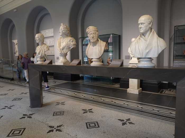 白大理石による写実的な表現で、政治家・芸術家・思想家・文学者などの顔立ちを残していた。 手前から ・William Stuart ・John Raphael Smith ・George II ・???