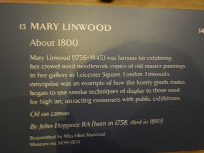 Mary Linwood (1756–1845) was famous for exhibiting her crewel wool needlework copies of old master paintings in her gallery in Leicester Square, London. Linwood's enterprise was an example of how the luxury goods trades began to use similar techniques of display to those used for high art, attracting customers with public exhibitions.