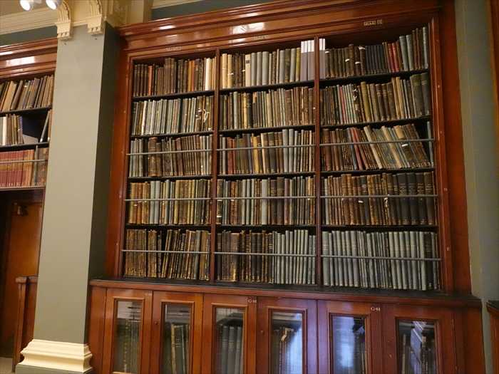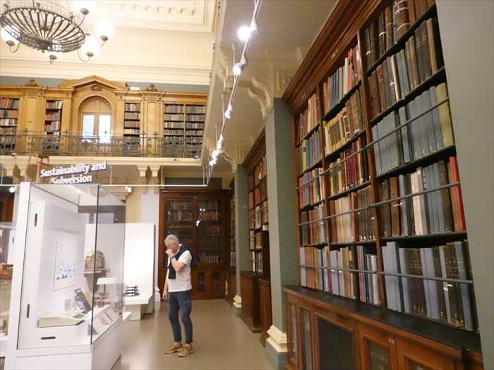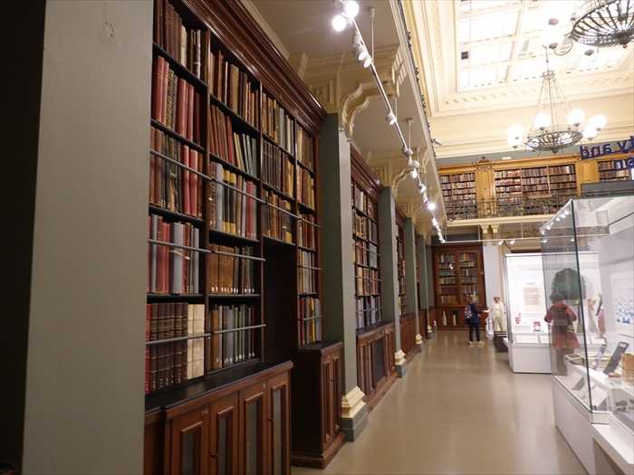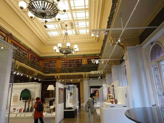 National Art Library(ナショナル・アート・ライブラリー)書庫の外壁。 右手の背の高い木製書架は図書館の実物の書庫、左手の白い展示ケースと “Sustainability and Subversion”のサインはデザイン・ギャラリーのテーマ展示の一部。 二層構成になっており、上階は鋳鉄手すりの回廊、天井からシャンデリア