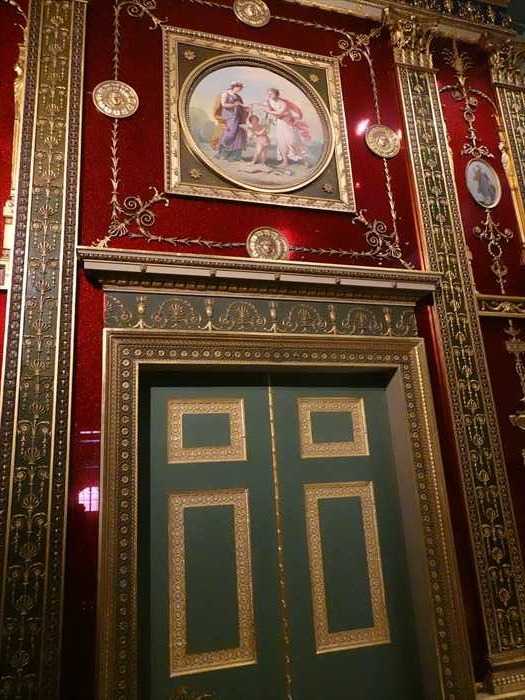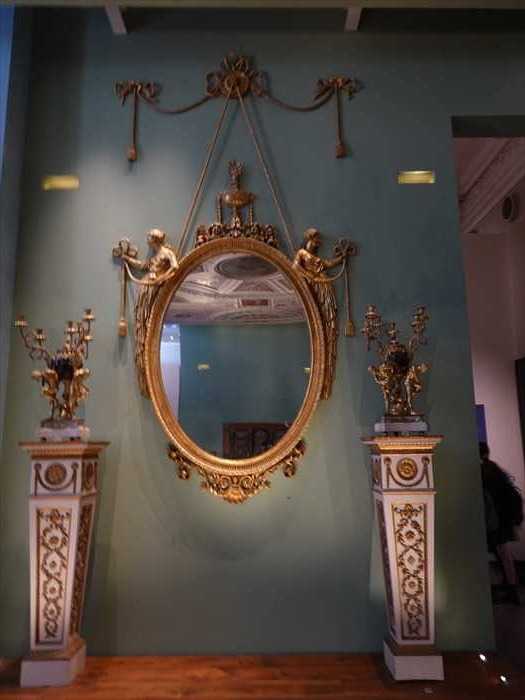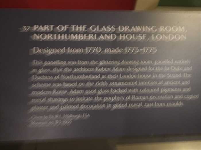 This panelling was from the glittering drawing room, panelled entirely in glass, that the architect Robert Adam designed for the 1st Duke and Duchess of Northumberland at their London house in the Strand. The scheme was based on the richly ornamentedi nteriors of ancient and modern Rome. Adam used glass backed with coloured pigments and metal foils to imitate the porphyry of Roman decoration and copied plaster and painted decoration in gilded metal, cast from moulds.