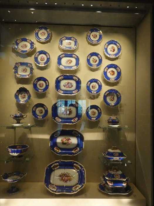 This large service is characteristic of the extensive and richly decorated porcelain that was available to an increasingly wide range of buyers during this period. Marketing through London showrooms played an important role in the selling of such ensembles. Massed displays were a familiar sight to the visiting public as in the Wedgwood showroom illustrated on the left.