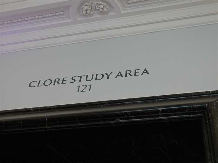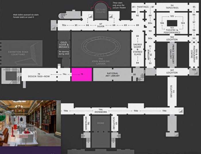 右側:John Madejski Garden 左側:National Art Library(ナショナル・アート・ライブラリー)の入口 金文字「NATIONAL ART LIBRARY」扉はこの左壁沿い(写真フレーム外)にあった。 前方:西(Room 74 側)