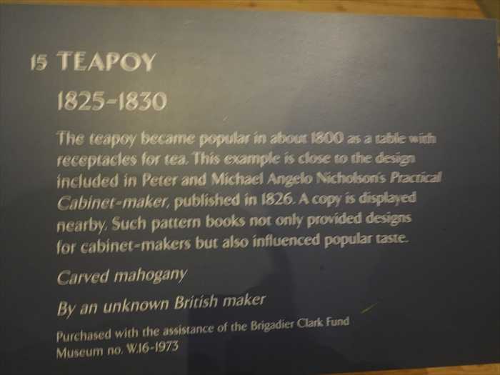 「TEAPOY The teapoy became popular in about 1800 as a table with receptacles for tea. This example is close to the design included in Peter and Michael Angelo Nicholson’s Practical Cabinet-maker, published in 1826. A copy is displayed nearby. Such pattern books not only provided designs for cabinet-makers but also influenced popular taste. Carved mahogany By an unknown British maker Purchased with the assistance of the Brigadier Clark Fund Museum no. W.16-1973」