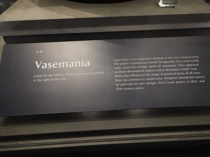 Vases were a very important element of the Neo-classical style. The pottery manufacturer Josiah Wedgwood, who could hardly make them fast enough, spoke of“vasemania”. They appeared as three-dimensional objects and as decorative motifs. Vase forms also influenced the shape of practical items of all sorts, from tea canistersto candlesticks. Designers plundered sources far and wide for new designs, from Greekpottery to 16th- and 17th-century prints.」