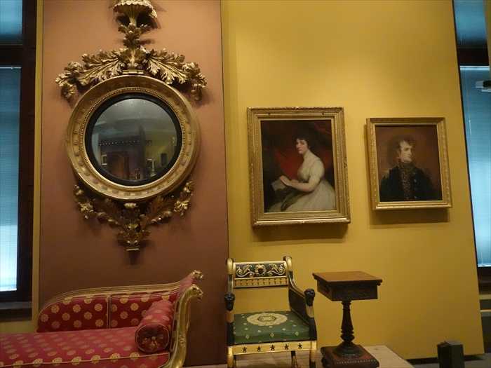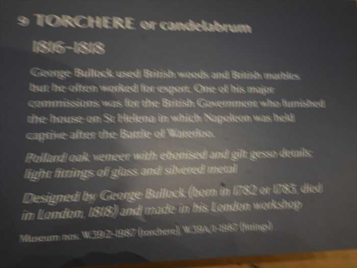 George Bullock used British woods and British marbles, but he often worked for export. One of his major commissions was for the British Government who furnished the house on St Helena in which Napoleon was held captive after the Battle of Waterloo.