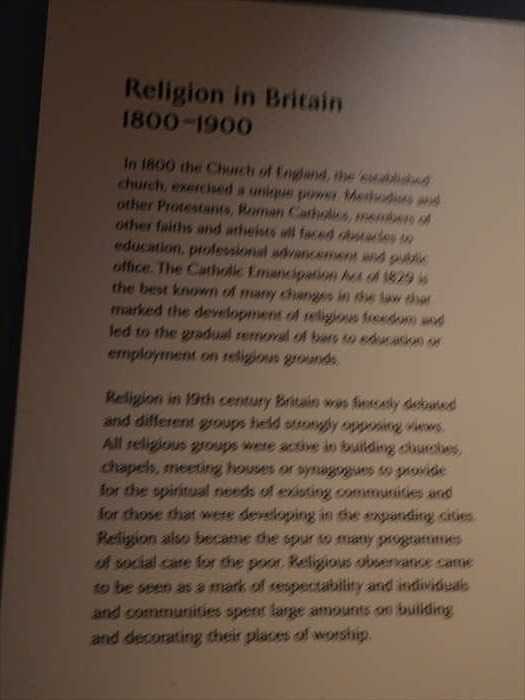 「Religion in Britain 1800–1900 In 1800 the Church of England, the established church, exercised a unique power. Methodists and other Protestants, Roman Catholics, members of other faiths and atheists all faced obstacles to education, professional advancement and public office. The Catholic Emancipation Act of 1829 is the best known of many changes in the law that marked the development of religious freedom and led to the gradual removal of bars to education or employment on religious grounds.Religion in 19th century Britain was fiercely debated and different groups held stronglyopposing views. All religious groups were active in building churches, chapels, meetinghouses or synagogues to provide for the spiritual needs of existing communities and for those that were developing in the expanding cities. Religion also became the spurto many programmes of social care for the poor. Religious observance came to be seen as a mark of respectability and individuals and communities spent large amounts on building and decorating their places of worship.」