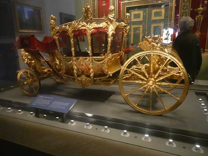 The basic design of this State Coach was intended to reflect Britain’s [power] underthe new King George III. In the decoration by William Chambers, [painted] panels by Giovanni Cipriani and carving by Joseph Wilton show [sea-gods] and figures of[Tritons] symbolising sea-power. The coach has been used since 1762 and is still used on important ceremonial occasions.