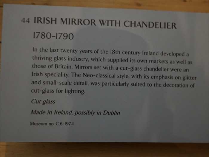 In the last twenty years of the 18th century Ireland developed a thriving glass industry, which supplied its own markets as well as those of Britain. Mirrors set with a cut-glass chandelier were an Irish speciality. The Neo-classical style, with its emphasis on glitter and small-scale detail, was particularly suited to the decoration of cut-glass for lighting.