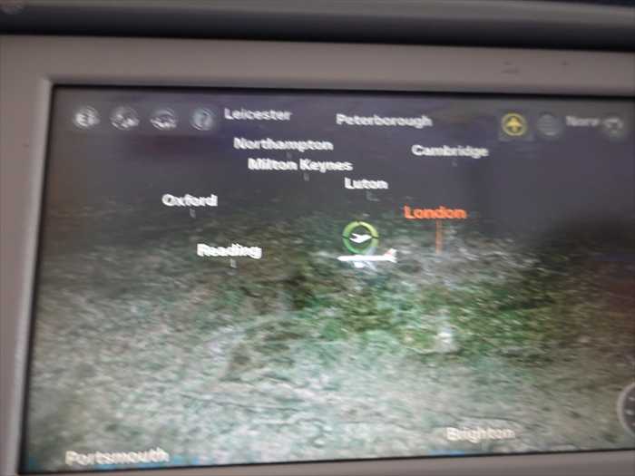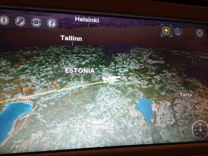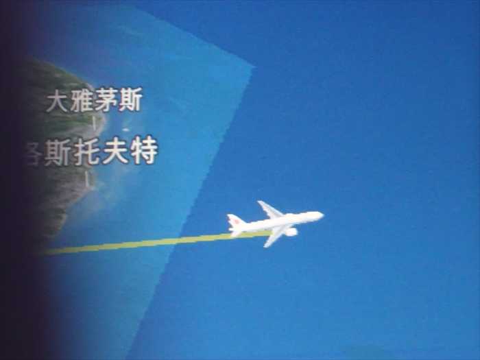 飛行機の座席モニターに表示されたフライトマップ(機内航路画面)を追う。