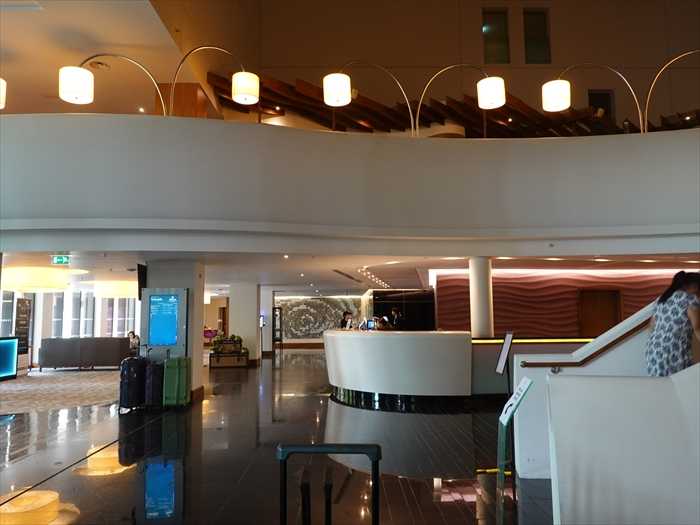 ・写真中央に見える白い円形のカウンターが、メイン・レセプション(チェックインデスク)。