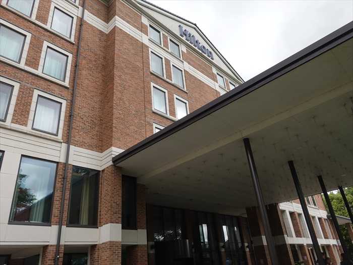 ・上階の三角形屋根部には「Hilton」の青いロゴサインが掲げられ、シンボル的存在。