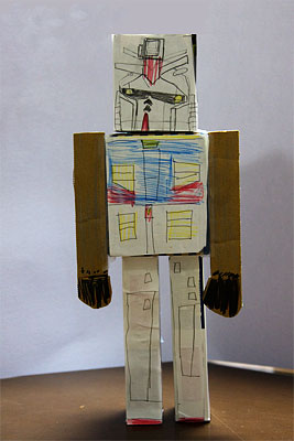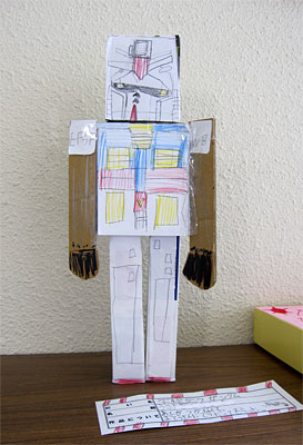 昨日から前期後半授業開始でした。荷物の多さに大笑い。いや、そんな全部持っていかなきゃダメなのかなあ。とりあえずいきなり体育なんかないだろうから、体操袋は置いていってはどうだろう?という提案も、「いや、ホラお母さんみてごらん。持ってくるリストに書いてあるからダメだよ」と、あっさり却下。どういう訳だか、そういう所は真面目なのよね。後はグズグズなんだけど。しかし、、、、ランドセル以外に3ッも肩掛けバックって(笑)、しかもパンパンで、コレ、転んだら起きれないんじゃないの? ちょっとお相撲さんみたいで可愛いけどさ。彼の場合、上靴が去年の夏から「装具」あつかいのバスケットシューズみたいな甲の高い奴履いてるから、ものすごく嵩が高いんです。もう、それだけで一つカバンを占領しちゃうような感じ?まあ、、上靴はしょうがないとして、せめてこのお道具箱は明日でもいいと思うよ~という説得になんとか応じ、それでも2ッなんだけど、まあ、集団登校でエイコラと行きました。小学校ぐらいだと初日に宿題を全部持って行かなきゃダメだしね。あ、そうそう、これ↓かずぴー入魂の力作「学校に立つガンダム」(笑)。なんか、タイトルも付けなきゃいけなかったそうで、帰ってからタイトル名を聞きました。自由研究というから、なんか「皆既日食」の事調べるとか、なんかそんな事をしなきゃいけないのかと思ってたら、工作とか絵でもいいみたいですね~。私が小学校の時は、絵の宿題も自由研究の宿題も別々にあったけどなあ。彼曰く、どうしてもお台場ガンダムをみてから作りたかったみたいで、夏休み早々にチクチクやってました。定規でサイズ測ったりして(笑)。そういうトコはマメだよね。ダンボールを切ったりするのは、お父さんに手伝ってもらってたのかな。ホントは上半身だけ作って満足していたんですけど、私が捨てようと思ってたワンデーアキュビューの空き箱を見て、猛烈に創作意欲が涌いたよう(笑)。後付で足も装着。で、ビームサーベルが無いコトに気付き(笑)、ストローをランドセル(?)部分に付け足してました。思いっきり張りぼてなのはご愛敬(笑)。結構、出来がいいかも。ホント、、自分がスキな事は勝手にどんどんやってくれるんだけどね~(タメイキ)。まあ、、、そんなもんか。