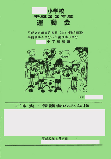 今週の週末、ついに運動会。うーん。そんなに活躍できないのは解ってるけど、まあ、頑張ってくれいとしか言えない運動会((; ̄ー ̄A アセアセ。ま、でも、彼なりの腕の見出所があるんですよー。ポスターを描くとか、そういったいわゆる裏方の仕事。1年生の時は、学校外に張り出すポスターに選ばれたみたいだしね(^_^)。で、毎年、どうやらかずぴーの学校ではずっと、3年生が運動会に配られるプログラムの表紙を描いているみたいなんです。確か、去年もそうだったし。「あー、僕の描いた奴がえらばれると嬉しいんだけど」そして、その後に続けて、恥ずかしいのか、でも僕はいい加減に描いちゃおうかな♪みたいなことを言っていました。「それはダメだよ。そーいうことをしたら絶対悔いが残るから、一生懸命描きなさい。そしたら、君は上手なんだから選ばれるかどうかは知らないけども、それなりの評価は受けるハズだから」そんなやり取りがあったのが、一週間くらい前。で、昨日帰ってくると、、、「ね、運動会のプログラムの表紙、誰になったと思う? お母さんのよーく知ってる人になったよ♪」(*^^)v(*^^)vもう、ウッキウキの顔(笑)。お、すごい。もしかして??「え、おかあさんが知ってる子?」「うん! すごくよく知ってる子だよ。ものすごくね!」「お、もしかして、、」「そうだよ!! 僕だよ。僕!v( ̄ー ̄)v」あ、ほんとだ。おおおお、すごい(*^_^*)!!たぶん、そこには先生方のご配慮があったのかもしれませんけれども、まあ、かずぴー、絵は上手だからどっぱずれの選考ではなかったハズ(と思いたい)笑。そおんな積み重ねが自信につながるといいなー。追伸そうそう、今回の創作ダンスの演目は、なんとジャクソン5の「I Want You Back」らしく、その中でムーンウォークも披露するとか(笑)。すごい(大爆笑)。