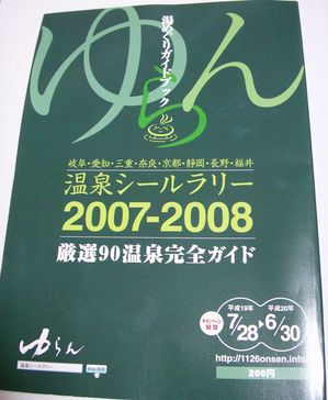 今年も 温泉シールラリーが、始まります。2007年 7月28日~ 2008年 6月30日までです。湯めぐりガイドブックゆらんを200円で、購入して 後ろにシールをはっていきます。愛知 岐阜 三重 奈良 京都 静岡 長野 福井 全部で、90湯です。今年はどれくらい回れるかな? 楽しみです。