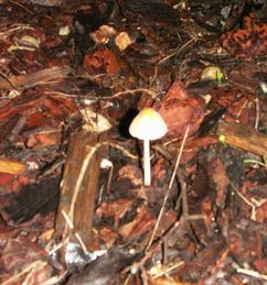 ここのところの 長雨で、庭に いろんなキノコが、生えてきた。今日 お初にお目にかかるキノコが、・・・ 庭の一部に バークチップという木の破片をいっぱい曳いた そこから一本のキノコが。・・・・これがそのキノコ 何だろう? オーストラリア産のバークなので、海外のキノコ?思わず 食べれるんだろうか?と思ってしまいました。なんだろな? このキノコ 今どんどん増えています。