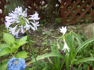 台風が、こちらに向かっているので、庭の花たちを非難させたり ・・・・飛ばないように中に入れたり バタバタとした一日でした。外は、風がだんだん強くなってきました。無事 台風が通り過ぎますように。 アバガンサス と何か白い花 とアジサイが、咲いています。(自生)つぼみだったミニ胡蝶蘭のリンリンが、満開になりました。