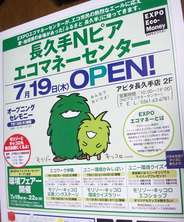 久しぶりに モリコロ関係です。エコマネーセンター 長久手が、7月19日木 オープンしました。場所は、アピタ長くて店内です。今日 行ってきました~ クイズに答えるとエコバックが、もらえます。アピタオリジナルなので、モリコロは、ついていません。 ショップや エコ体験が、できます。子供たちがいろいろやってました♪