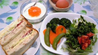昨日 食生活が、あまりにお粗末だったので 反動で、朝から ガッツリ バストラミビーフサンドのサンドイッチを作る スライスたまねぎたっぷり ライ麦パンに パストラミビーフ挟んで^^ ブロッコリー 地元産にんじん スナップエンドウ ボイル キャベツ レタス ベビーリーフ 青紫蘇 わかめ トマトのフレッシュサラダ 山虎みかんのトッピング 脂肪0%ヨーグルト(無糖) ゆでたまご 野菜ジュース カフェオーレ