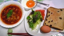 熱々 ミネストローネ 今日は寒いので キャベツたっぷり のミネストローネ 糖質0%あらびきウインナー ぶどうパン 1枚167kcal サラダ ゆで卵 ヨーグルト みかん