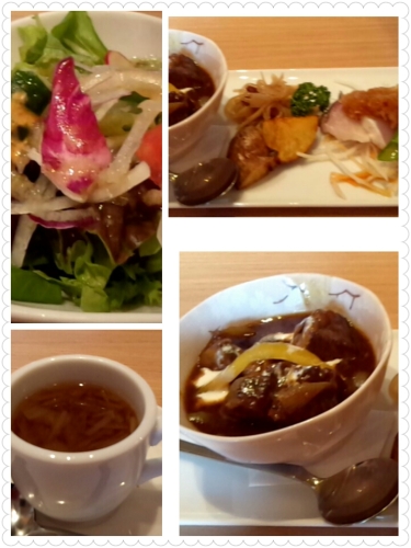 ささゆりの湯 レストラン 野菜サラダの中に 串原のこんにゃく ハム入り うまうま 野菜多し 五平餅も うまうま 結構 ボリュームあり