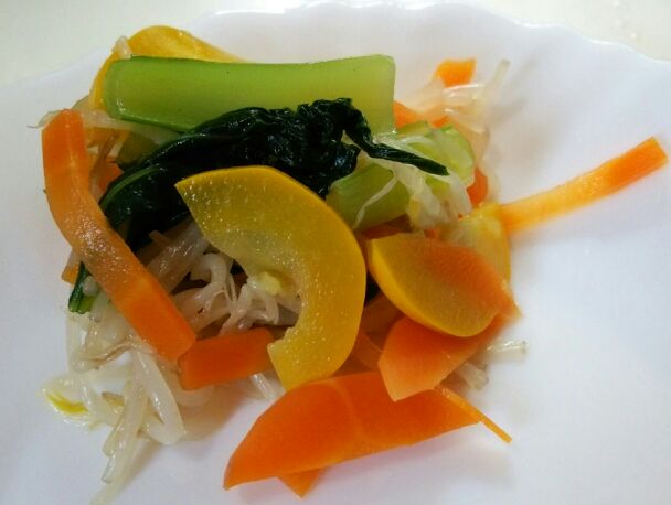 今日のおひたし黄色いズッキーニともやし人参 小松菜 簡単 うまうま