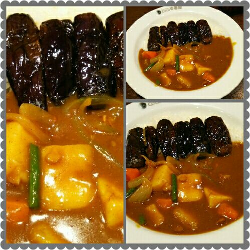ナスと野菜のカレー nkucchanさんのブログで トッピングの下手なカレーを見て 近所のココイチに 茄子 ここは おいしそうに並べてあるナス つやつや きれいに具が入っていて 茄子 ピカピカつやつやで、きれい~ 日進店は 良かったです^-^